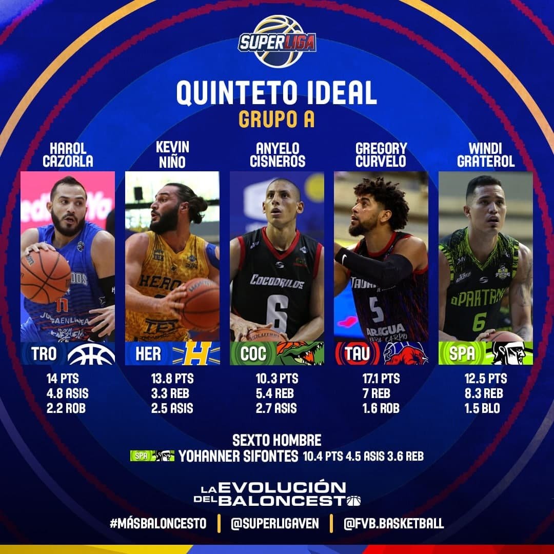La Superliga confirmó los cinco mejores jugadores del grupo A con un quinteto conformado por Harol Cazorla, Kevin Niño, Anyelo Cisneros, Gregory Curvelo y Windi Graterol, quedando el pívot de Spartans como MVP de este grupo disputado en el Parque Miranda gracias a sus promedios de 12.5 puntos, 8.3 rebotes y 1.5 tapones. Por este grupo, el Mejor Sexto Hombre fue Yohanner Sifontes.