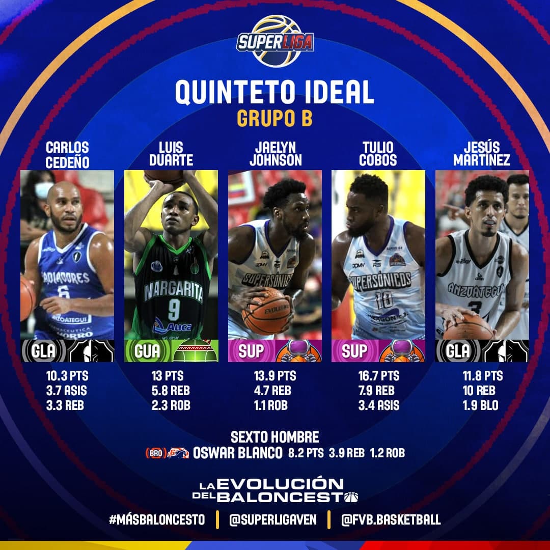 Por el grupo B, el quinteto ideal lo conformaron Carlos «Margarito» Cedeño, Luis «Tapipa» Duarte, Jaelyn Johnson-Coston, Tulio Cobos y Jesús «Torta» Martínez, quedando el pívot de Gladiadores como MVP de esta conferencia gracias a sus promedios de 11.8 puntos, 10 rebotes y 1.9 tapones. Además, Oswar Blanco fue nombrado como el mejor Sexto Hombre.