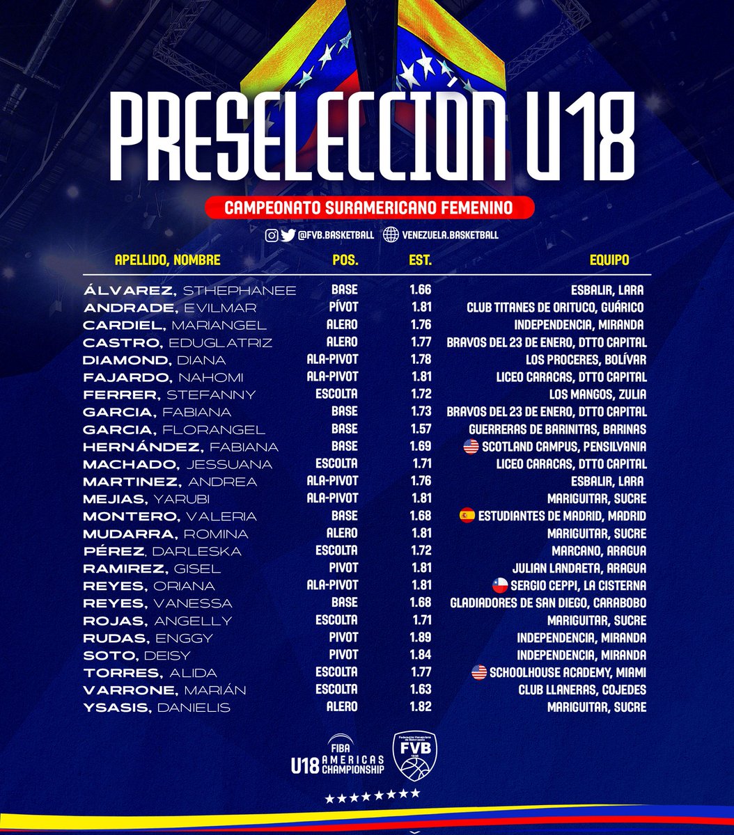 La lista está conformada por 25 jugadoras, que se pondrán a las órdenes del coach Eduardo Pinto a partir de este lunes 21 en el Poliedrito de Caracas, salvo las jugadoras del exterior que se incorporarán en la primera semana de marzo.