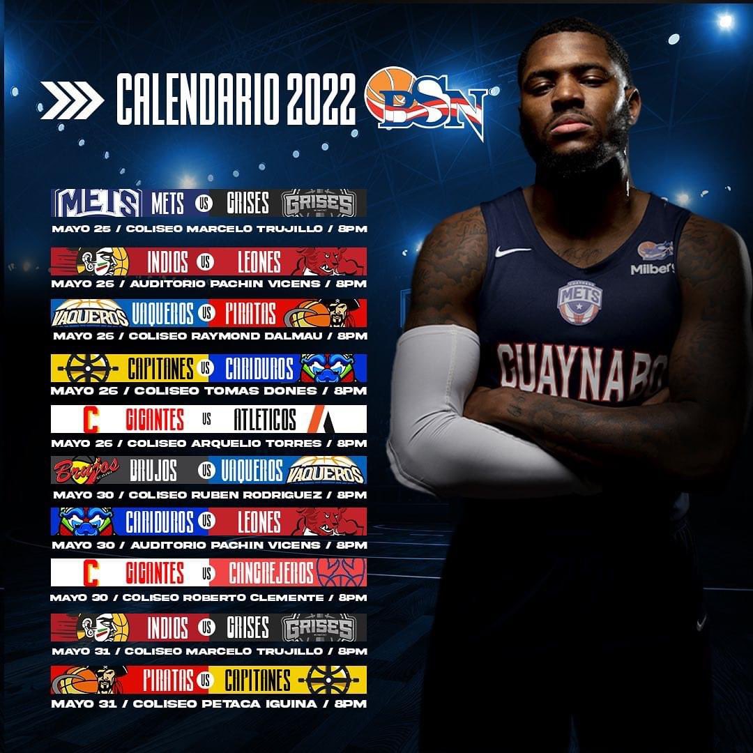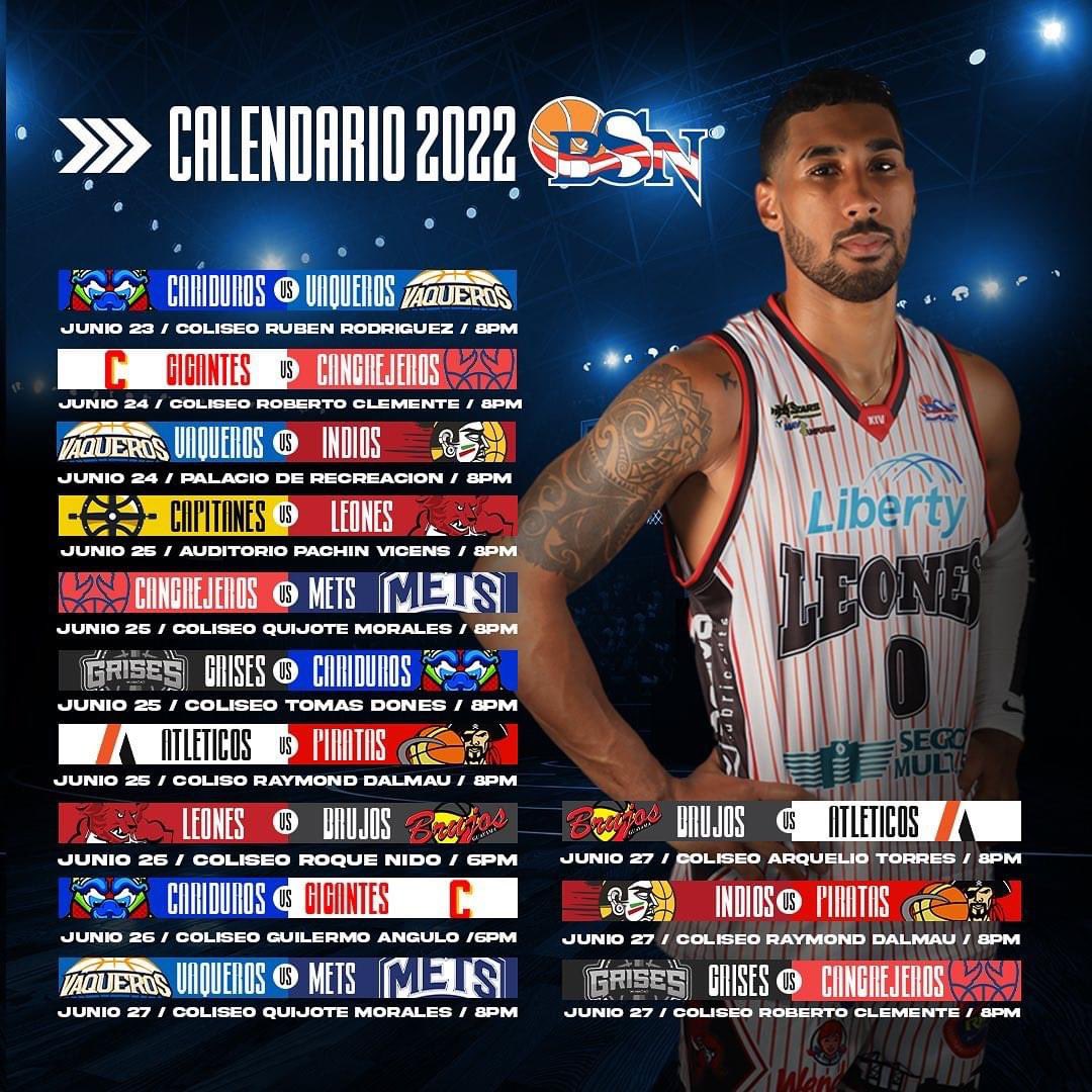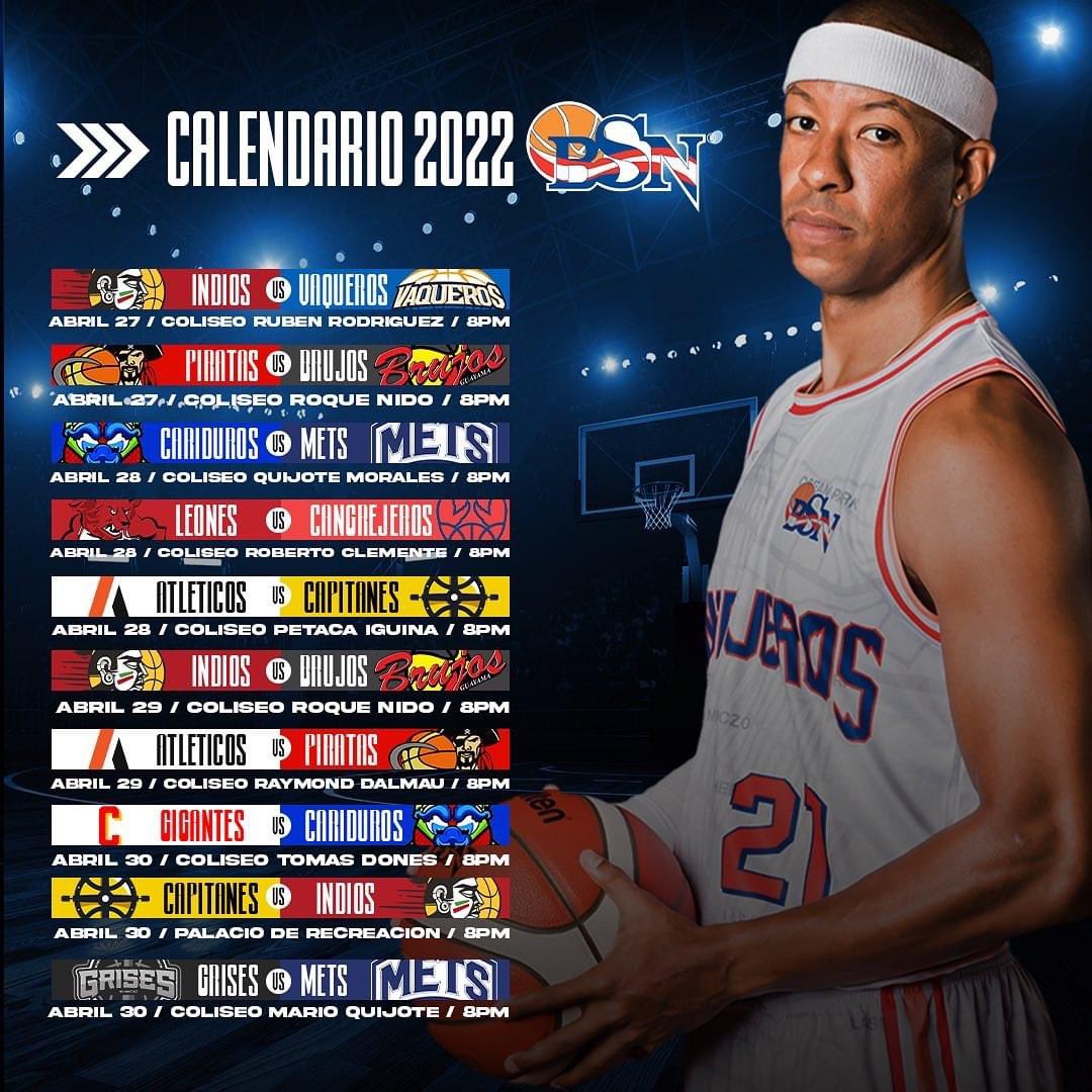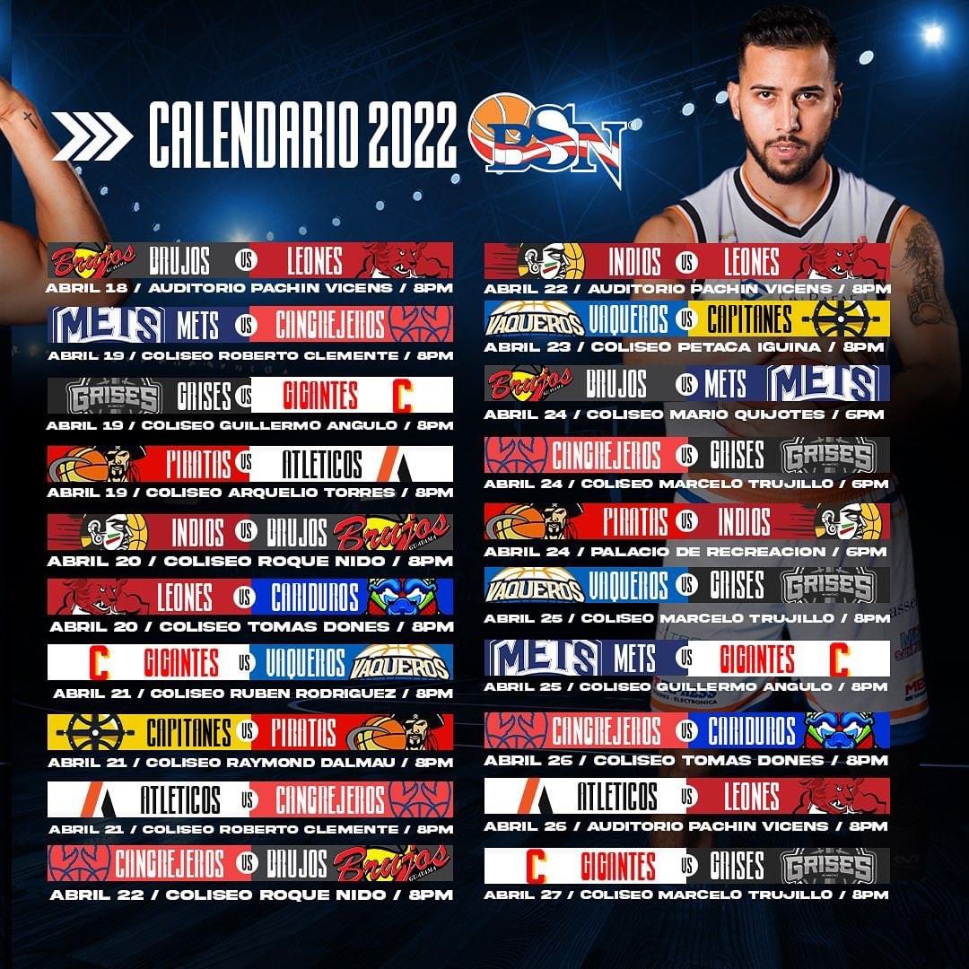 El Baloncesto Superior Nacional anunció el calendario de juegos para la temporada 2022 que comenzará el 9 de abril cuando los Piratas de Quebradillas visiten a los Gigantes de Carolina a las 8:00pm en el Coliseo Guillermo Ángulo en el regreso de los Sábados de BSN por Telemundo.