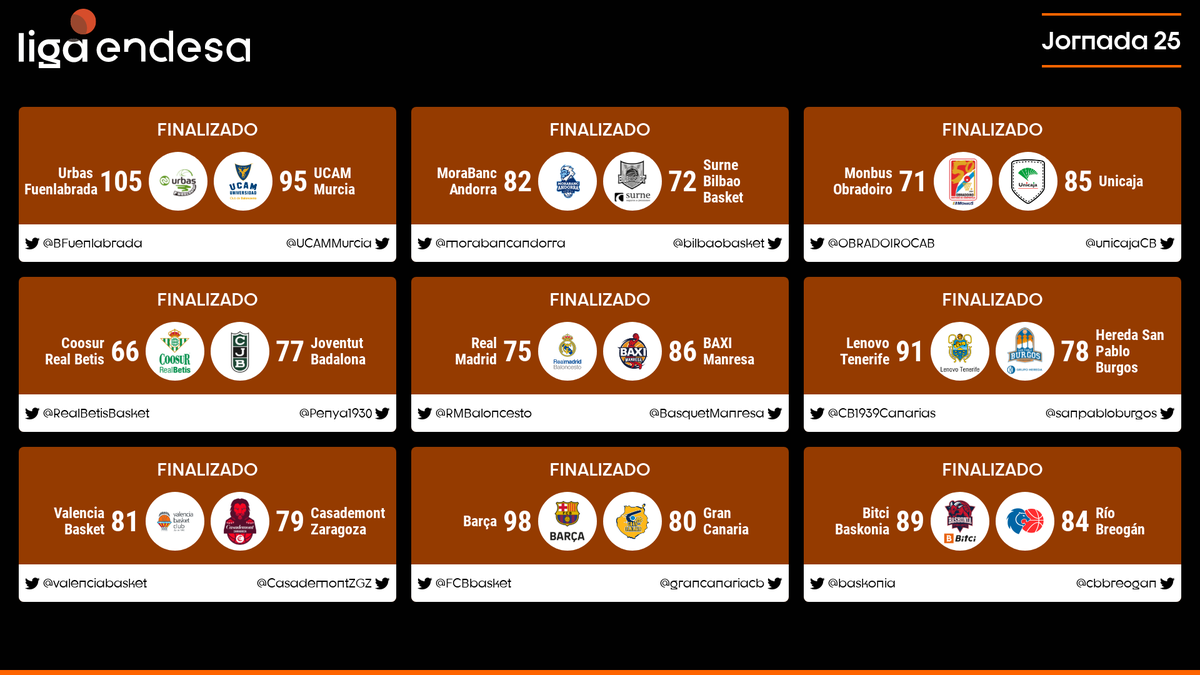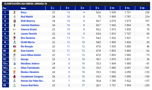 La jornada 25 fue la protagonista de la Liga Endesa en este fin de semana, con muchas victorias en la zona baja de la clasificación y la sorpresa de Manresa en cancha del Real Madrid que no impidió que Gabriel Deck fuese el más destacado de los latinos en esta fecha.