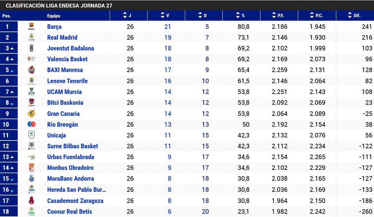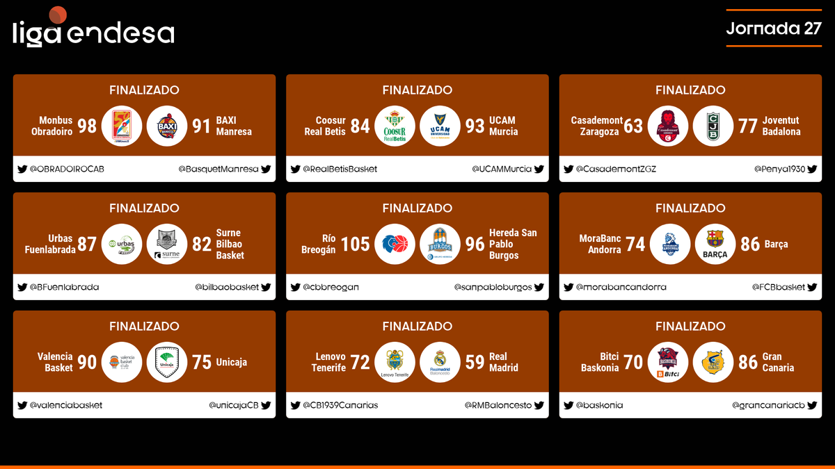 La Liga Endesa va encarando la recta final de su fase regular y este fin de semana fue el turno para una jornada 27 no exenta de resultados sorprendentes y que coronó a Vitor Benite como MVP Cancha Latina.