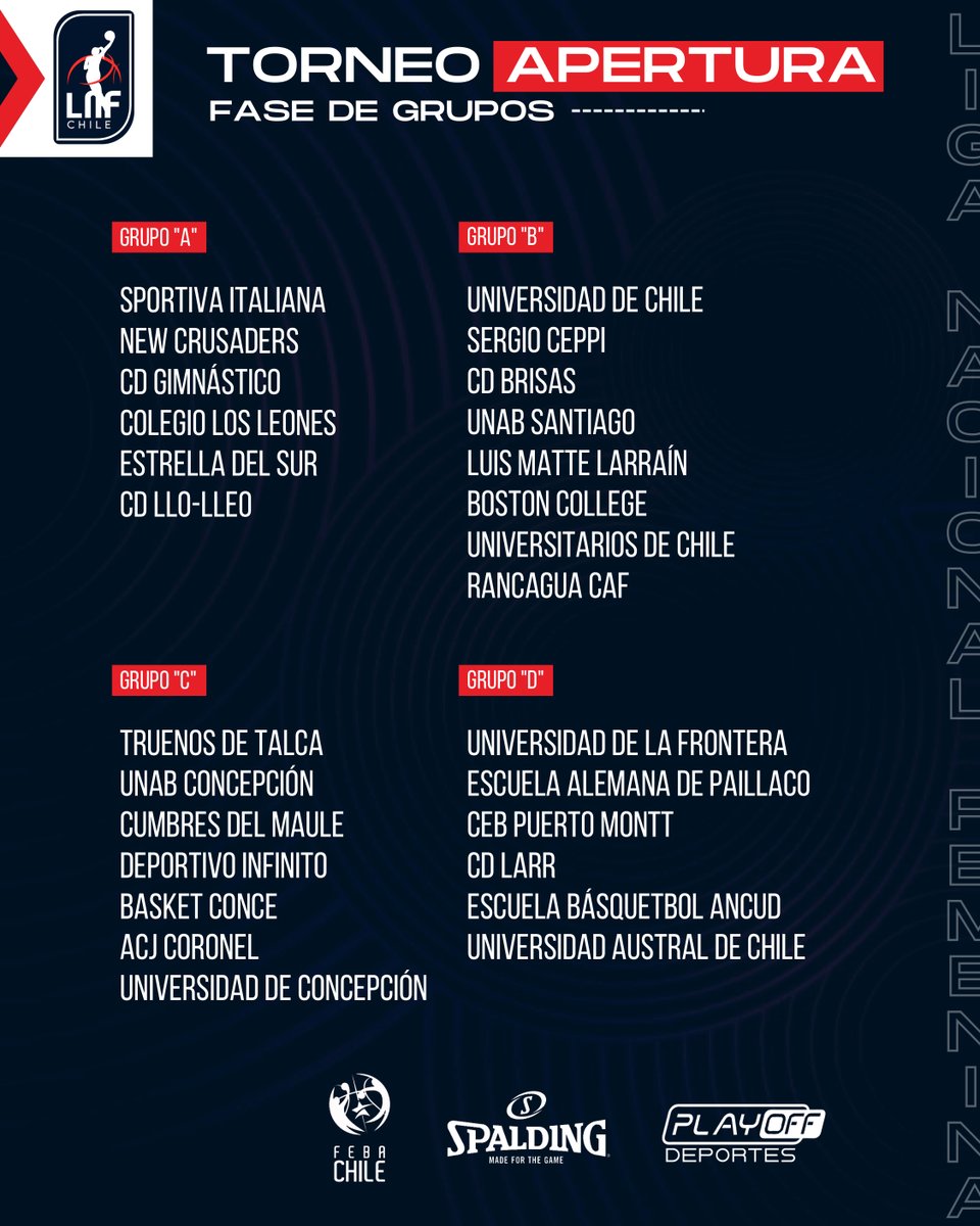 - En la Zona “C” participarían: Truenos de Talca, UNAB Concepción, Cumbres del Maule, Universidad de Concepción, Deportivo Infinito, Basket Conce y CD ACJ Coronel.
