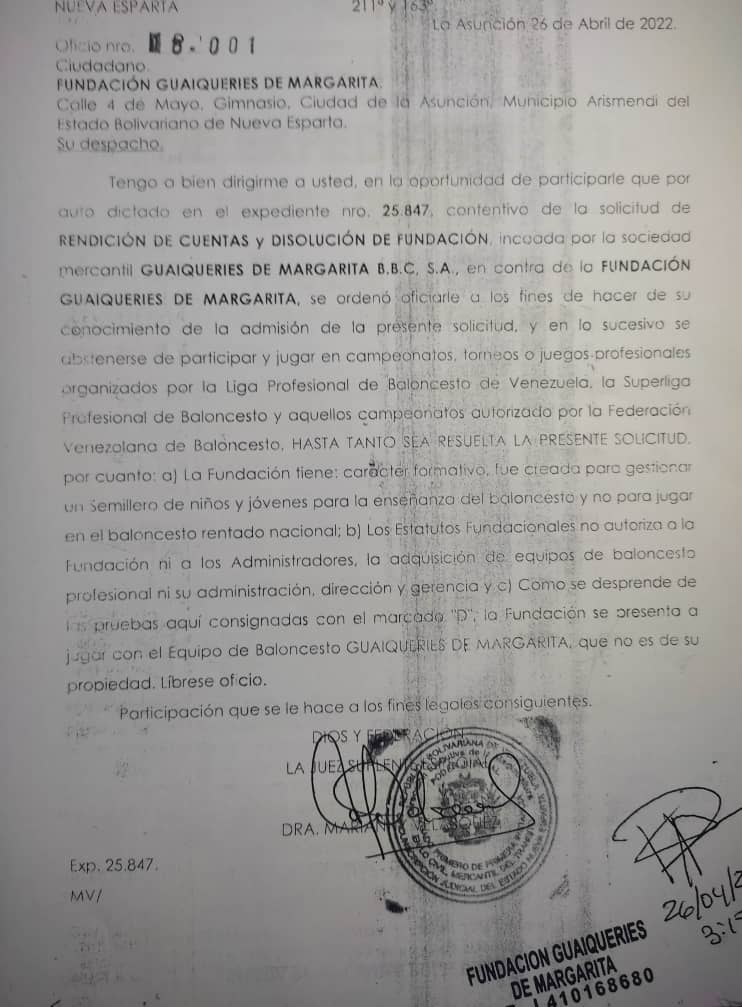 Según el documento que nos hicieron llegar a nuestra redacción fechado el 26/4/2022 y signado con el numero T-1-INST-25.847, el tribunal anteriormente nombrado le ordena a la Fundación Guaiqueries de Margarita: Abstenerse de participar y jugar en campeonatos, torneos o juegos profesionales organizados por la Liga Profesional de Baloncesto de Venezuela, la Superliga profesional de baloncesto y aquellos campeonatos que organice la Federación Venezolana de Baloncesto hasta tanto no sea resuelta la presente solicitud. Mas adelante el documento refleja: A) La fundación tiene carácter formativo, fue creada para un semillero de niños y jóvenes para la enseñanza del baloncesto y no para el baloncesto rentado nacional, B) Los estatutos fundacionales no autorizan a la fundación ni a los administradores, la adquisición de equipos de baloncesto profesional ni su administración, dirección y gerencia. C ) Como se desprende de las pruebas aquí consignadas con el marcado D, la fundación se presenta a jugar con el Equipo de Baloncesto GUAIQUERIES DE MARGARITA, que no es de su propiedad», finaliza el dictamen de la Juez.