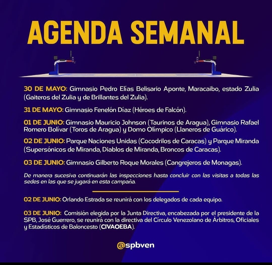 Por último, el propio presidente de la SPB José Guerrero encabezará una reunión con el Círculo Venezolano de Árbitros, Oficiales y Estadísticos de Baloncesto (CIVAOEBA) que se debería realizar el viernes 3 de junio.