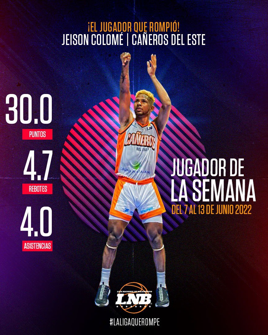 Jeison Colomé fue elegido como el Jugador de la Semana número tres de la Liga Nacional de Baloncesto, tras su brillante actuación entre el martes 7 y el domingo 12 de junio.
