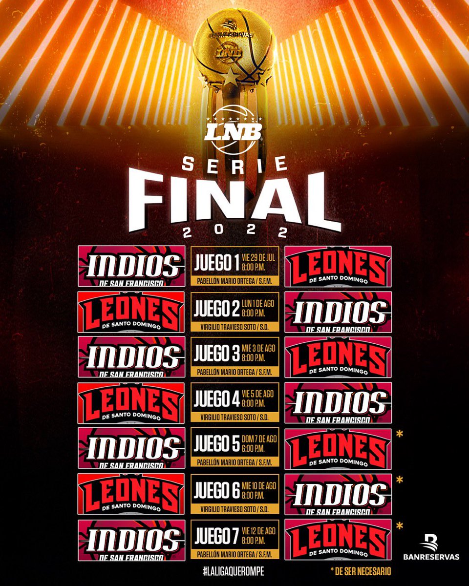 Los Indios de San Francisco de Macorís recibirán la visita de los Leones de Santo Domingo este viernes a las 8:00 de la noche en el techado Mario Ortega, para la apertura de la Serie Final 2022 de la Liga Nacional de Baloncesto (LNB).