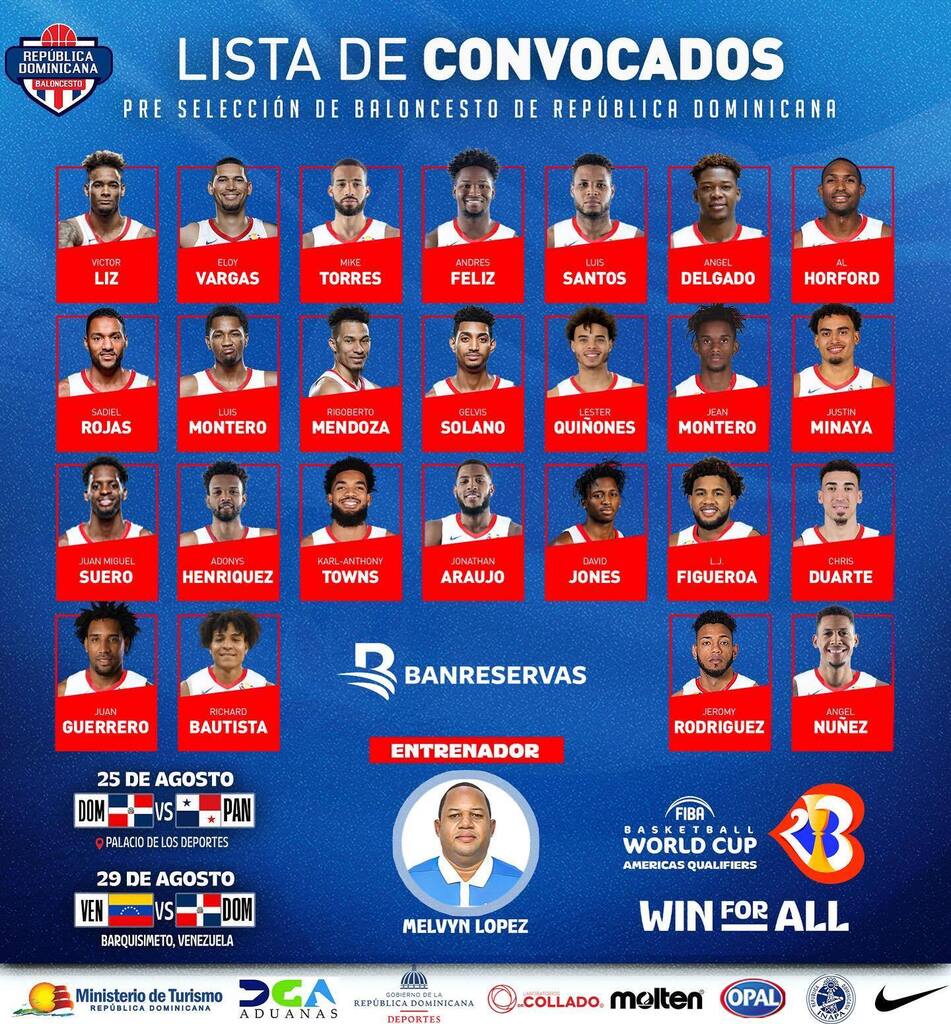 Al Horford, Karl Towns y Chris Duarte encabezan un listado de 25 jugadores de la que saldrá el roster definitivo que presentarán los dirigidos por el coach Melvyn López para sus partidos ante Panamá y Venezuela que darán inicio a la segunda ronda de esta fase clasificatoria.