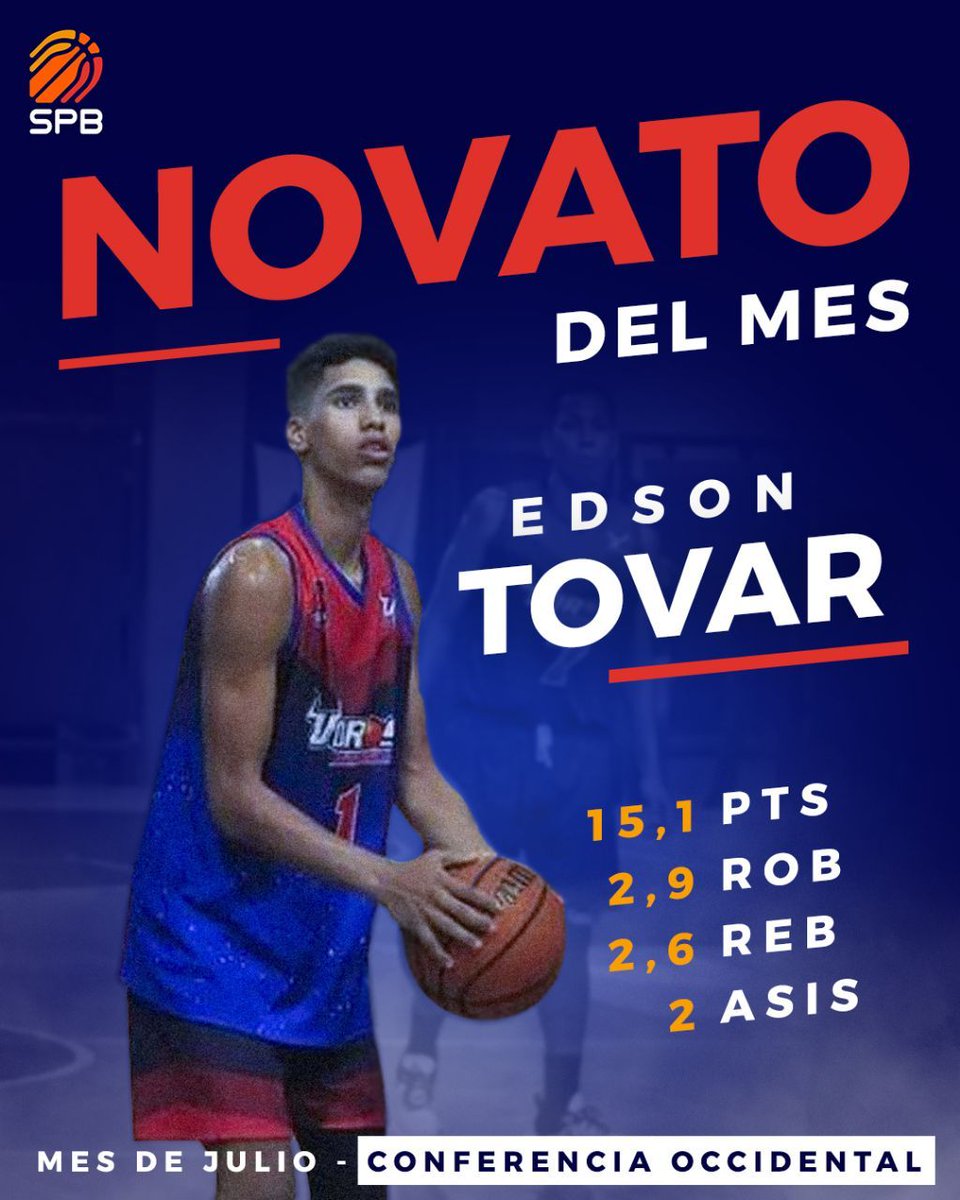 El escolta de 17 años Edson Tovar se llevó el galardón en la Conferencia Occidental, siendo la principal figura de Toros de Aragua. Tovar promedió en julio 15.1 puntos, 2.9 robos (segundo en la liga), 2.6 rebotes y 2 robos. Por su parte, Franger Pirela fue seleccionado como el novato más destacado en la Conferencia Oriental. “Lalo” promedió 5.5 puntos, 2.7 asistencias, 1.0 rebotes y 0.7 robos.