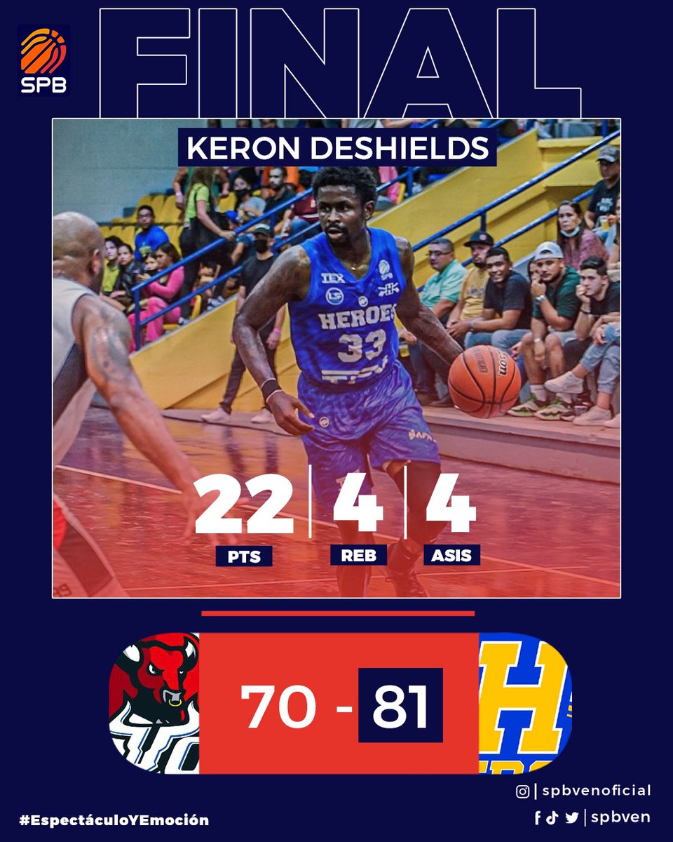 Héroes sigue peleando la clasificación. Héroes de Falcón derrotó a Toros de Aragua por marcador de 70-81, gracias al aporte del americano Keron DeShields. El conjunto falconiano supo aguantar su ventaja en el marcador partiendo de una mejor selección de disparos e intensidad defensiva.