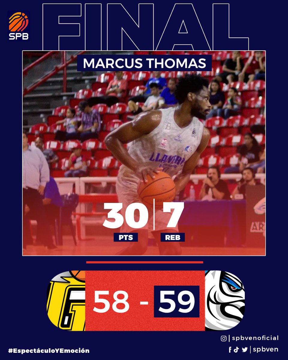 Llaneros de Guárico aprovechó al máximo su visita en el Gimnasio Pedro Elías Belisario Aponte de Maracaibo al derrotar a Gaiteros del Zulia por marcador de 58 por 59, de la mano de una gran actuación ofensiva de Marcus Thomas, que vivió una nueva noche espectacular. El importado registró 30 puntos y siete rebotes en los 37 minutos que disputó.