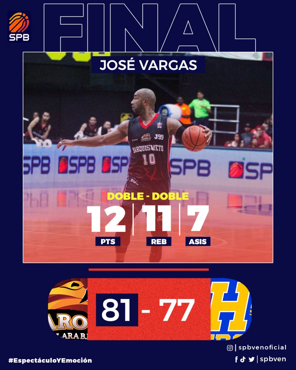 Guaros venció a Héroes en el Domo Bolivariano. Los de Barquisimeto vencieron a Héroes de Falcón por marcador de 81 – 77, gracias a la ofensiva y el liderazgo de José Vargas. El histórico capitán de la Selección Nacional registró una doble figura (12 puntos, 11 rebotes) y siete asistencias.