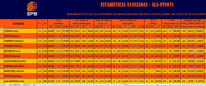 Como ejemplo, te ofrecemos un extracto de la clasificación de mejores ala-pívots según la estadística avanzada: