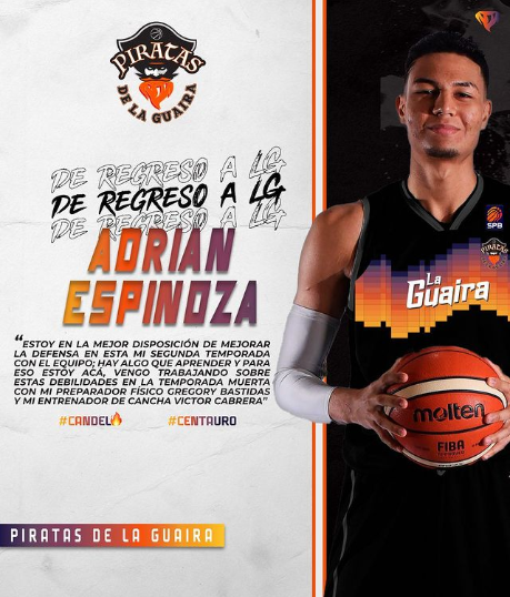Espinoza con experiencia en 2021 con Llaneros de Guarico y Diablos de Miranda, en 2022 con Piratas y este año defenderá nuestro uniforme nuevamente. En la temporada 2022 promedió 2.3pts, 0.9 Rebotes por partidos. Cuenta con experiencia en Argentina, jugó dos temporadas con Estudiantes de Concordia en la Liga de Desarrollo y con Independiente de Santiago del Estéreo en la Liga Argentina.