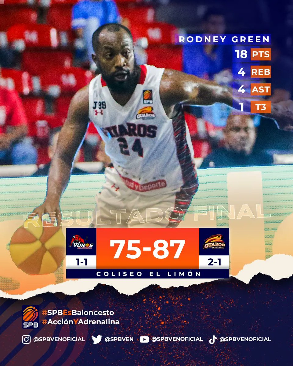 Braian Guidi anotó 17 puntos (tope en su carrera) y 7 rebotes, Javier Vargas anidó 12 más y Beiker Barrios anidó otros 11 unidades y 9 rebotes. Por los larenses, Rodney Green sumó 18 puntos, 4 rebotes y 4 asistencias y Heissler Guillent terminó 14 puntos, 2 rebotes, 7 asistencias y 2 robos.