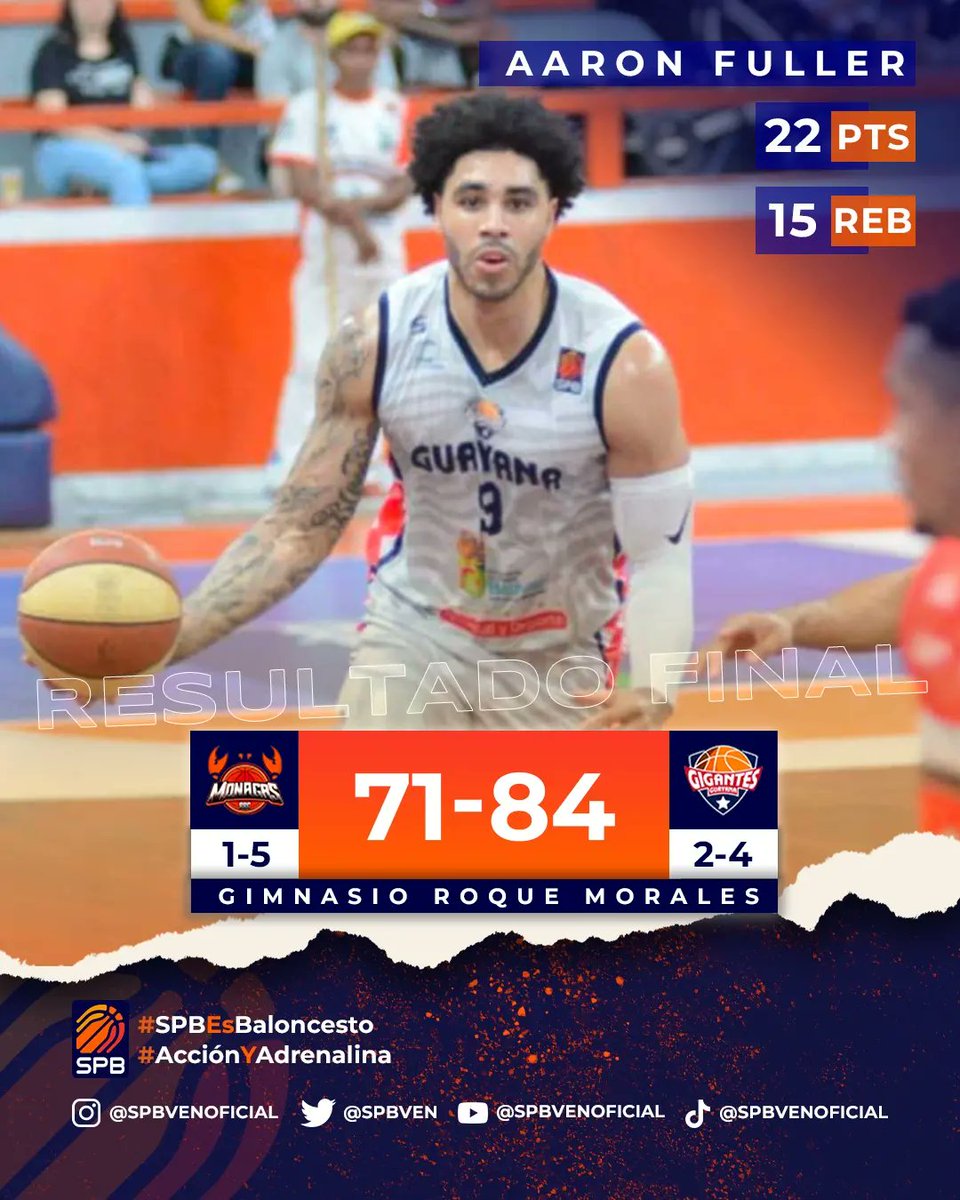 Gigantes de Guayana superó por 84-71 a Cangrejeros de Monagas en el Gimnasio Cubierto Gilberto Roque Morales de Maturín. Con otra sólida actuación de Aaron Fuller, quien anotó 22 puntos y capturó 15 rebotes, la maquinaria vinotinto se llevó el primer juego de una serie pautada a dos.