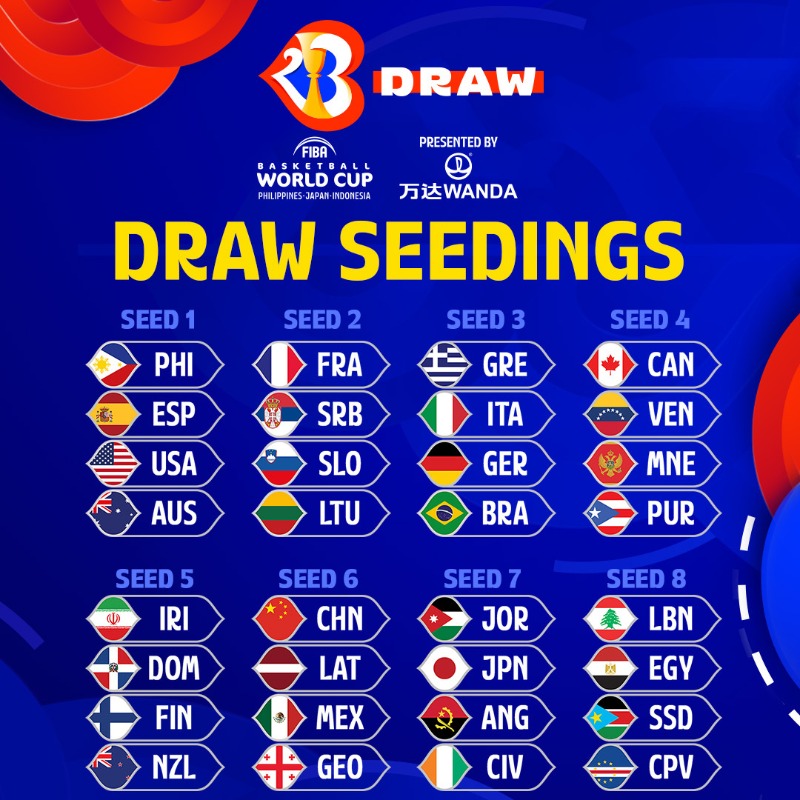 ¿Cómo se establecen los cabezas de serie? Los 32 equipos se han colocado en 8 bombos, cada uno con cuatro naciones. Filipinas, como anfitrión de la Fase de Grupos y Final, se coloca en el bombo 1. Todos los demás equipos se colocan en sus respectivos bombos en función de su posición en el Ranking Mundial FIBA Masculino,