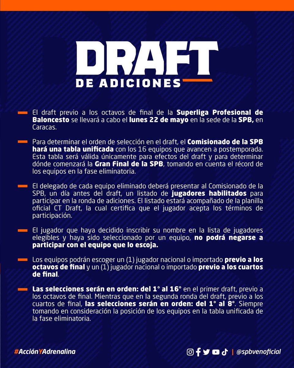 DRAFT DE ADICIONES: El draft previo a la ronda de octavos de final de la Superliga Profesional de Baloncesto se llevará a cabo el lunes 22 de mayo en la sede de la SPB, en Caracas.