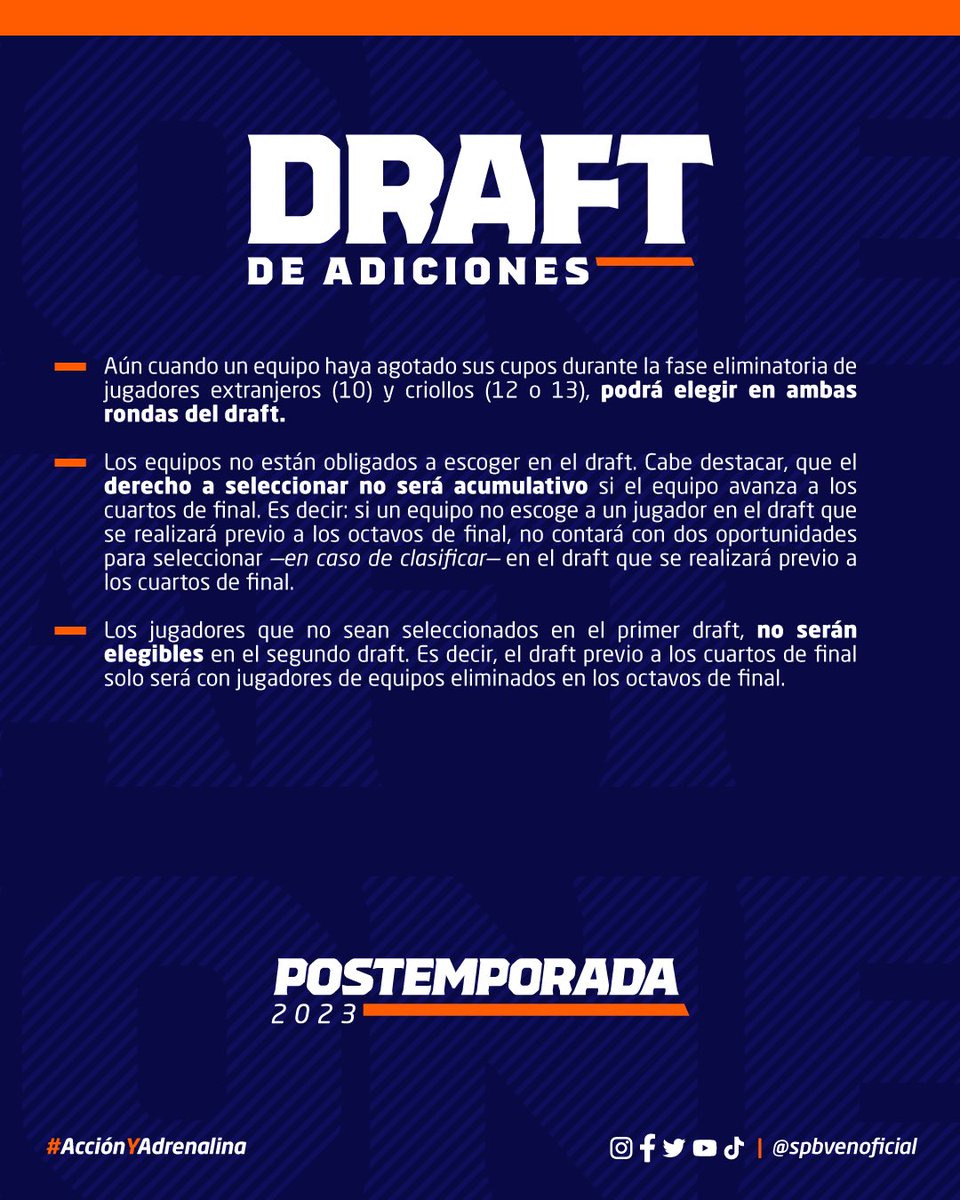 - Los equipos no están obligados a escoger en el draft. Cabe destacar que el derecho a seleccionar no será acumulativo si el equipo avanza a los cuartos de final de la SPB. Es decir: si un equipo no escoge a un jugador en el draft que se realizará previo a los octavos de final, no contará con dos oportunidades para seleccionar -en caso de clasificar- en el draft que se realizará previo a los cuartos de final.
