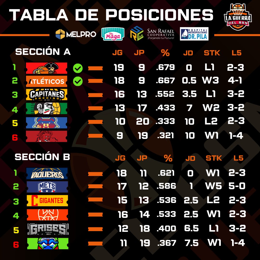 Por último, el encuentro que se estará transmitiendo por Punto2, los Leones de Ponce (9 – 19) visitarán el Arquelio Torres para enfrentarse a los Atléticos de San Germán (18 – 9).