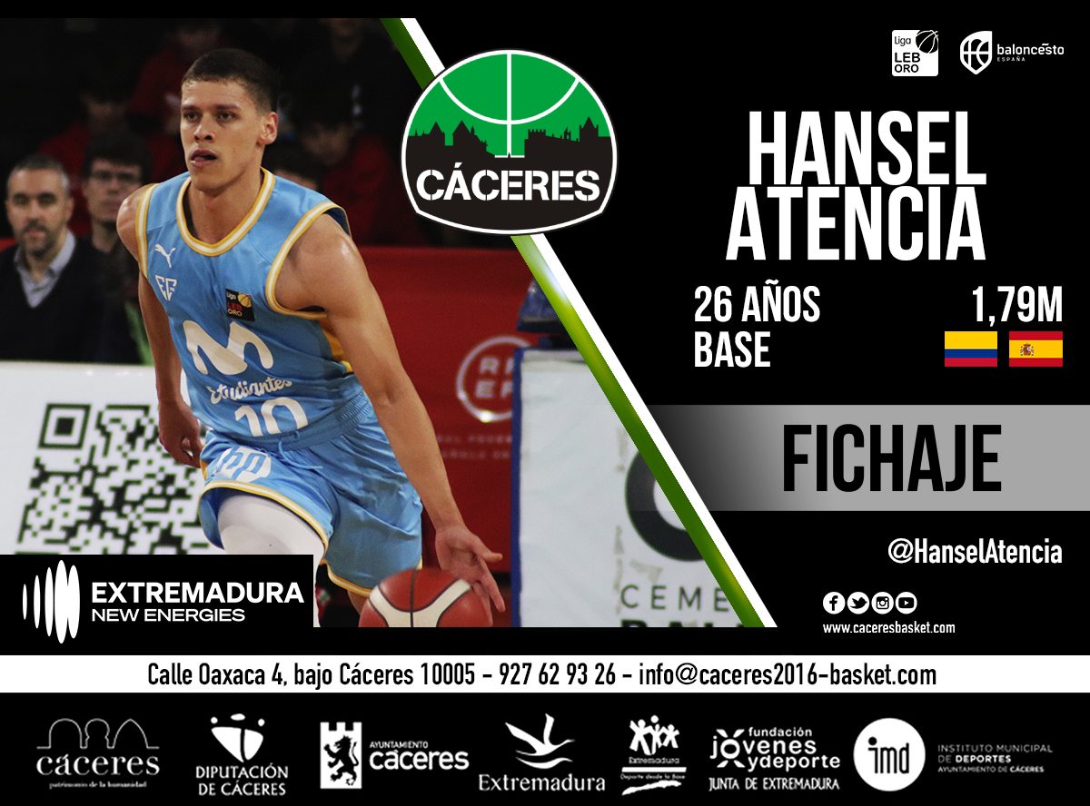 El Cáceres Ciudad del Baloncesto ha llegado a un acuerdo con el base internacional colombiano Hansel Atencia (Barrancabermeja (Colombia), 1997) para su incorporación la temporada 2023/2024 al primer equipo extremeño de LEB Oro, tras haber jugado la pasada campaña en las filas del Movistar Estudiantes.