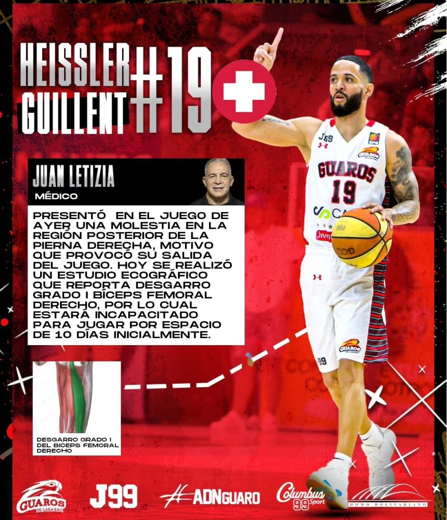 Tras la evaluación médica por parte del doctor Juan Letizia el Sastre Heissler Guillent presenta desgarro del bicep femoral grado 1, debido a la lesión el galeno creouscular recomienda un periodo de 10 días (inicialmente) para que retorne al tabloncillo.