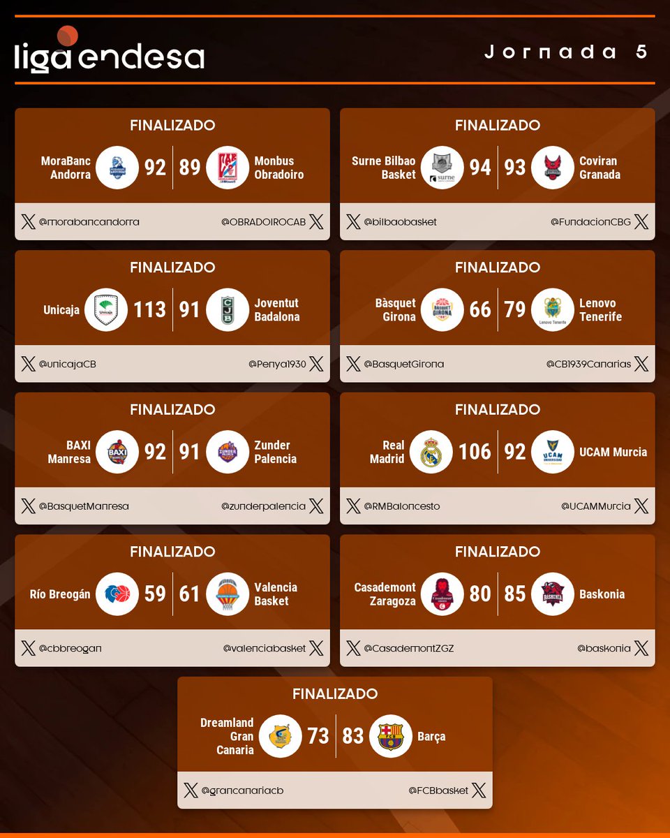 La jornada 5 de la Liga Endesa mantiene a Real Madrid como único invicto en una fecha con dos anotaciones centenarias, actuaciones menos prolijas para los jugadores latinoamericanos y con Nico Brussino como MVP Cancha Latina.