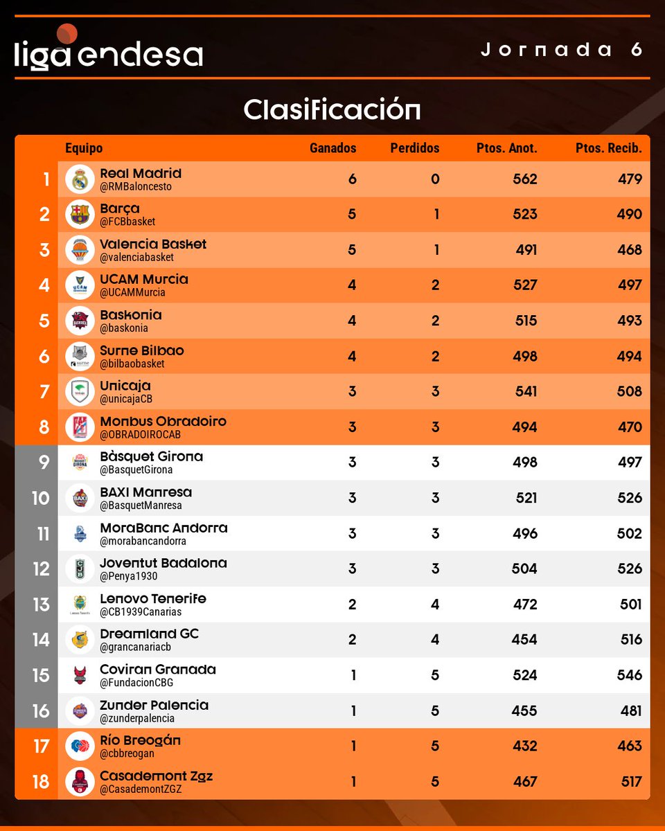 Este fin de semana tuvo lugar la jornada 6 de la Liga Endesa y mantiene a Real Madrid como único invicto y trajo las primeras victorias de Palencia y Granada. Fue una fecha con menos actuaciones latinoamericanas destacadas y fue Felipe dos Anjos el que se quedó con el MVP Cancha Latina tras liderar el primer triunfo de Andorra desde su dominio en la pintura.