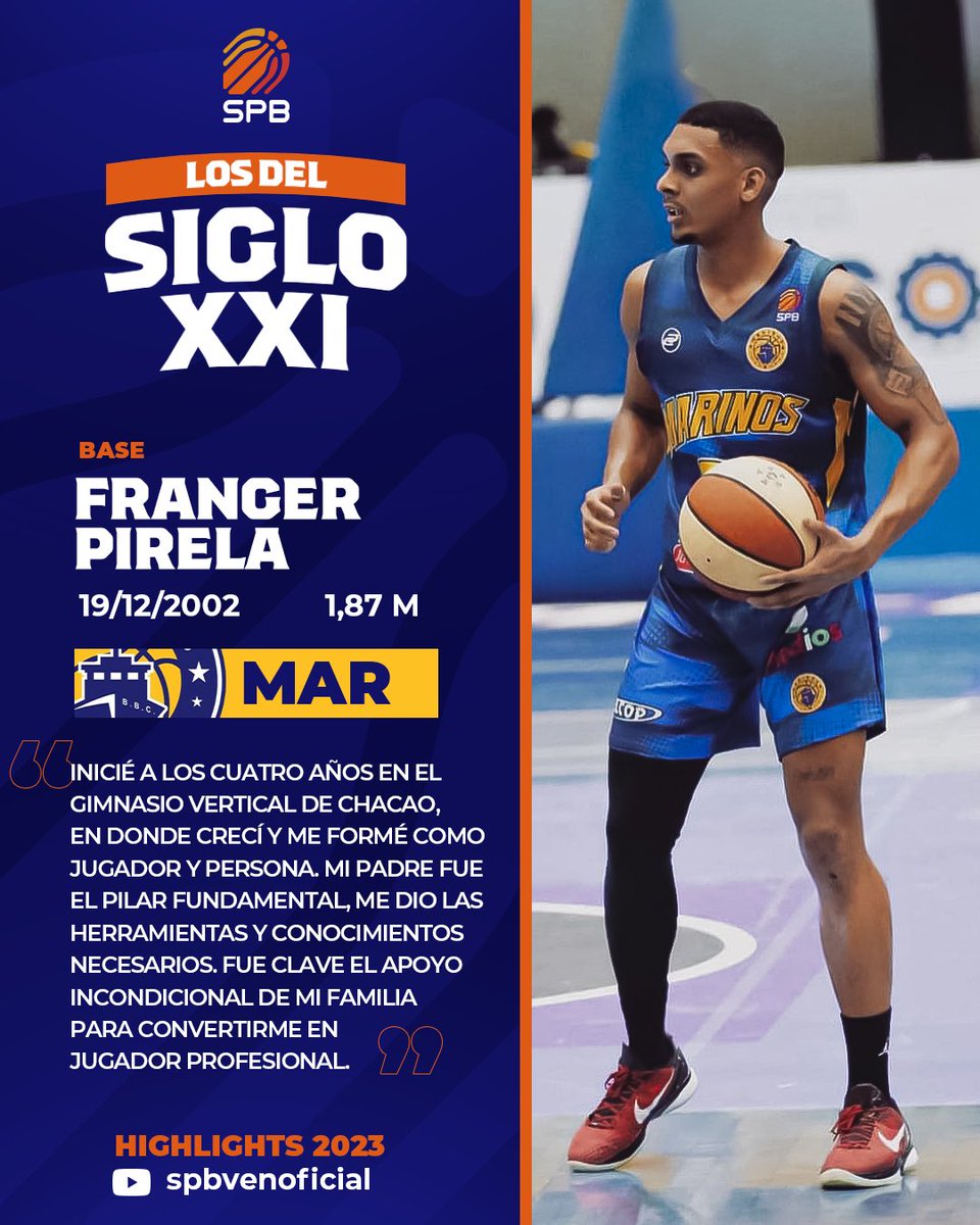 Franger Pirela es uno de los jóvenes jugadores con más presencia internacional ya que lleva varios años desarrollándose en España, primero con la Canarias Basketball Academy, más tarde con La Matanza en liga EBA y con Baskonia B en LEB Plata y esta temporada con Enrique Soler en la tercera división del país ibérico. «Lalo» está en el mundo del baloncesto desde los cuatro años cuando en el Gimnasio Vertical de Chacao y cuenta con un par de temporadas en Venezuela con Marinos y Gladiadores de Anzoátegui.