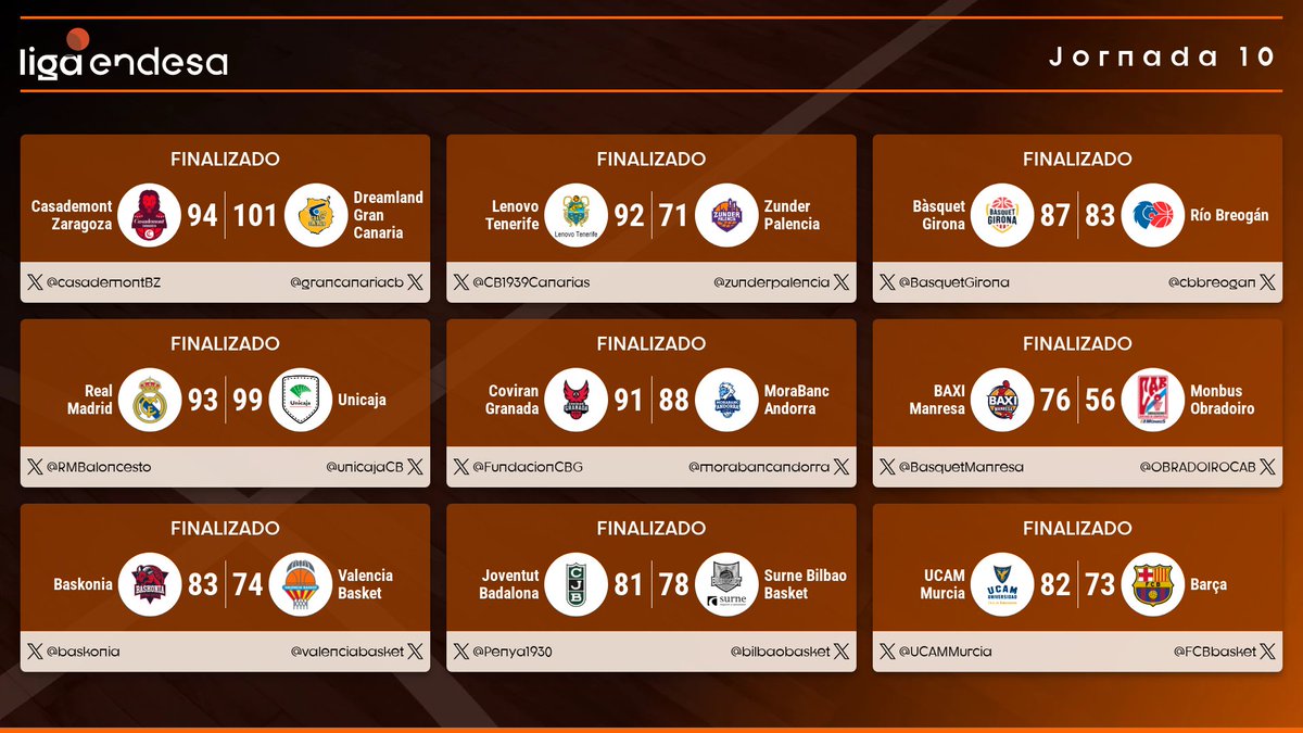 La jornada 10 de la Liga Endesa tuvo un desenlace trepidante con mucha emoción durante el fin de semana, dejando derrotas para Real Madrid y FC Barcelona, un triple ganador de Andrés Feliz y una gran cantidad de jugadores latinoamericanos destacando para acompañar el regreso del base dominicano tras su lesión.