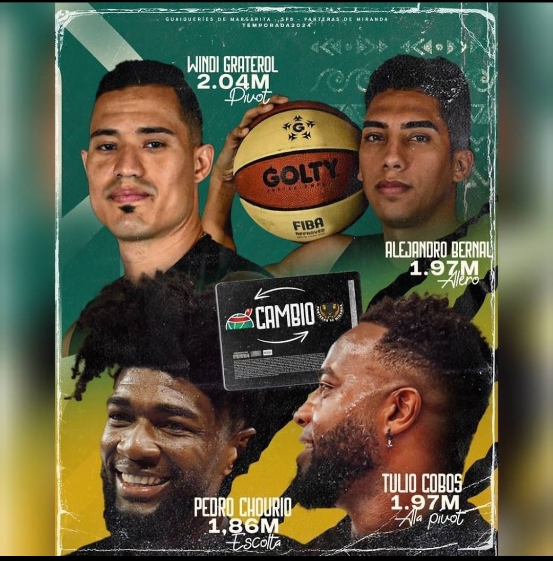 El escolta Pedro Chourio y el ala-pívot Tulio Cobos, ambos provenientes vía cambio. Chourio, conocido por su letal lanzamiento de larga distancia, llega a Margarita desde Panteras de Miranda a cambio de Windi Graterol. En la temporada 2023, promedió 10.9 puntos, 3.6 asistencias y 6.2 triples por partido, números que avalan su liderazgo, visión de juego y capacidad anotadora. Actualmente, Chourio se encuentra activo en el baloncesto brasileño con el Sao José, donde promedia 13.1 puntos, 2.4 asistencias y 3.4 rebotes por partido. Su experiencia internacional será un valor agregado para el conjunto margariteño.