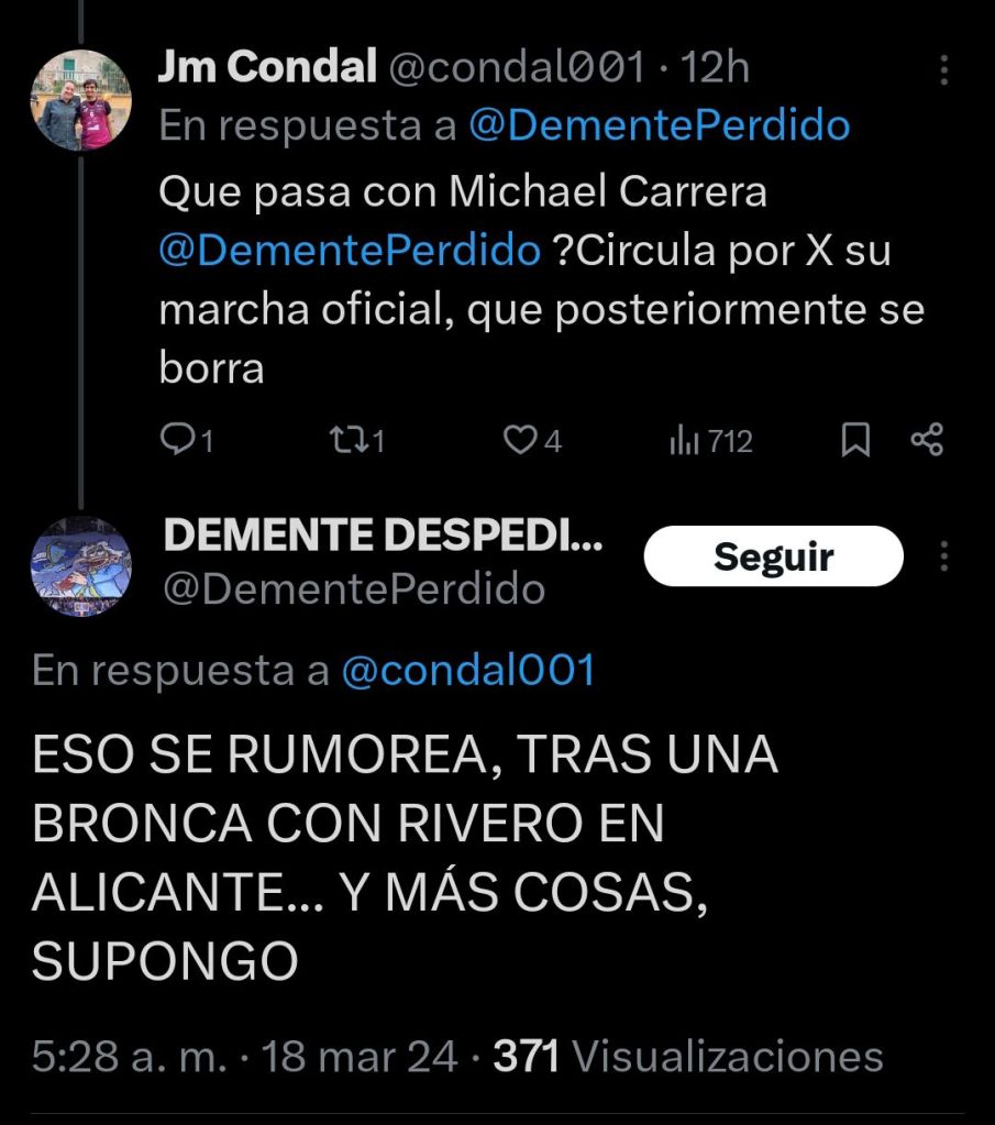 «Noticia de última hora: El @MovistarEstu y Michael Carrera negocian una rescisión de contrato. reflejó @AlenMartin95 en su cuenta de X. «El interior puede acabar la temporada jugando como hace habitualmente en Venezuela. El encontronazo con Pedro Rivero en el Ferrándiz el sábado, uno de los motivos»