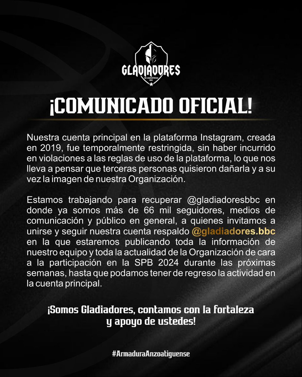 Por medio de un comunicado oficial el actual campeón del baloncesto Venezolano informo sobre una restricción temporal en su cuenta oficial @gladiadoresbbc, por tal motivo abrieron una alternativa @gladiadores.bbc