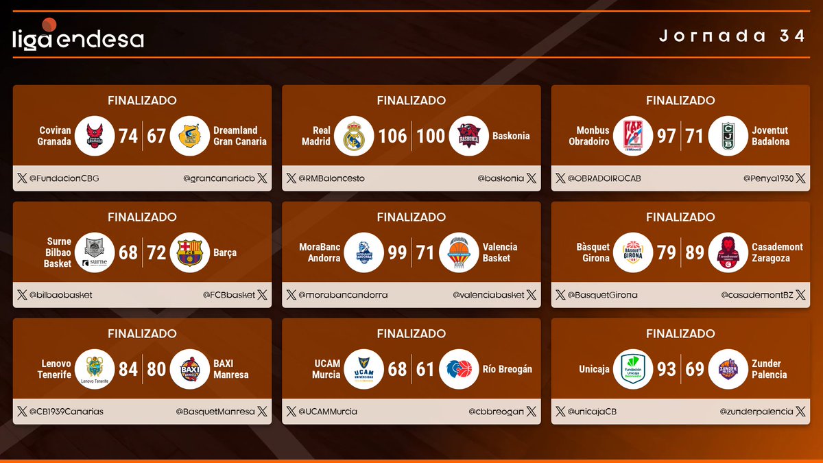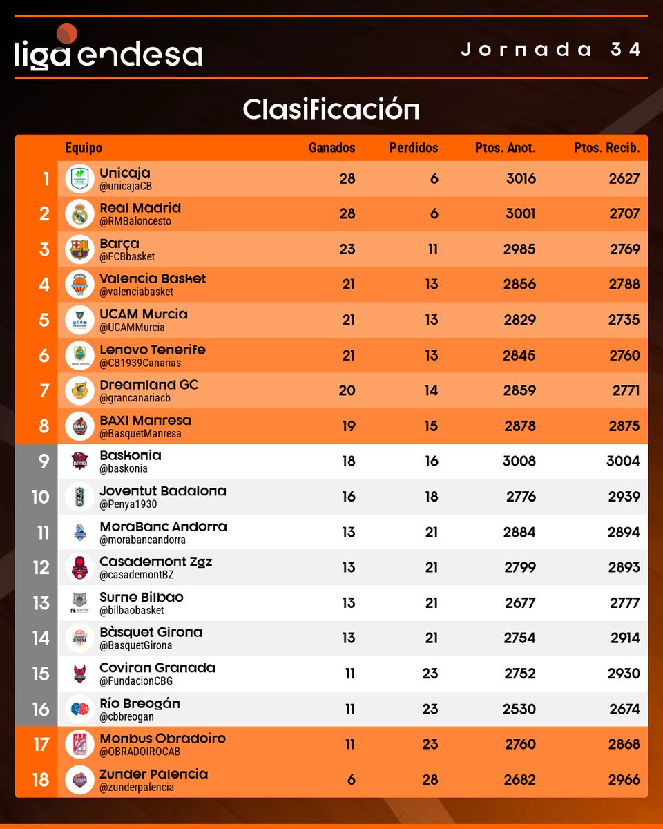 La fase regular terminó este domingo con horario unificado y dejó a Unicaja como líder, certificó el descenso de Obradoiro y definió el último billete a postemporada para Manresa. Por los jugadores latinoamericanos, hasta ocho de ellos terminaron en doble dígito en anotación con una nueva exhibición ofensiva de Jean Montero para liderarlos.