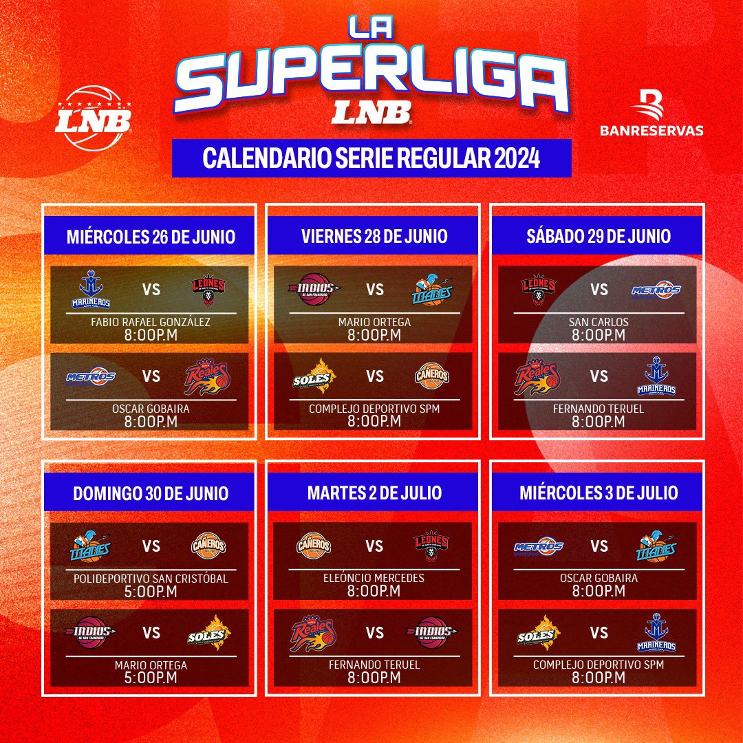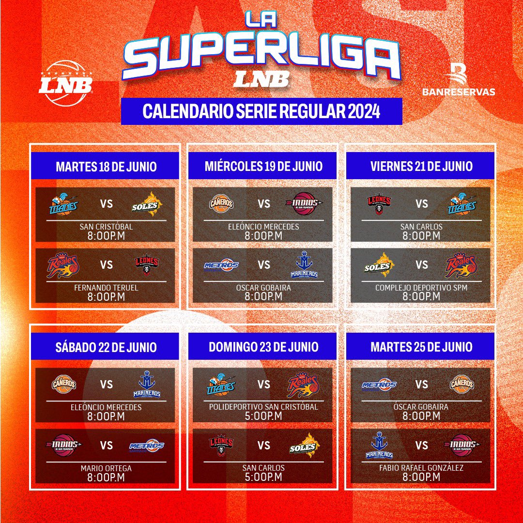 La temporada 2024 de La Súper Liga de la LNB comenzará el próximo martes 18 de junio, con los campeones nacionales Reales de La Vega recibiendo en su casa a los Leones de Santo Domingo en el Palacio de los Deportes Fernando Teruel.