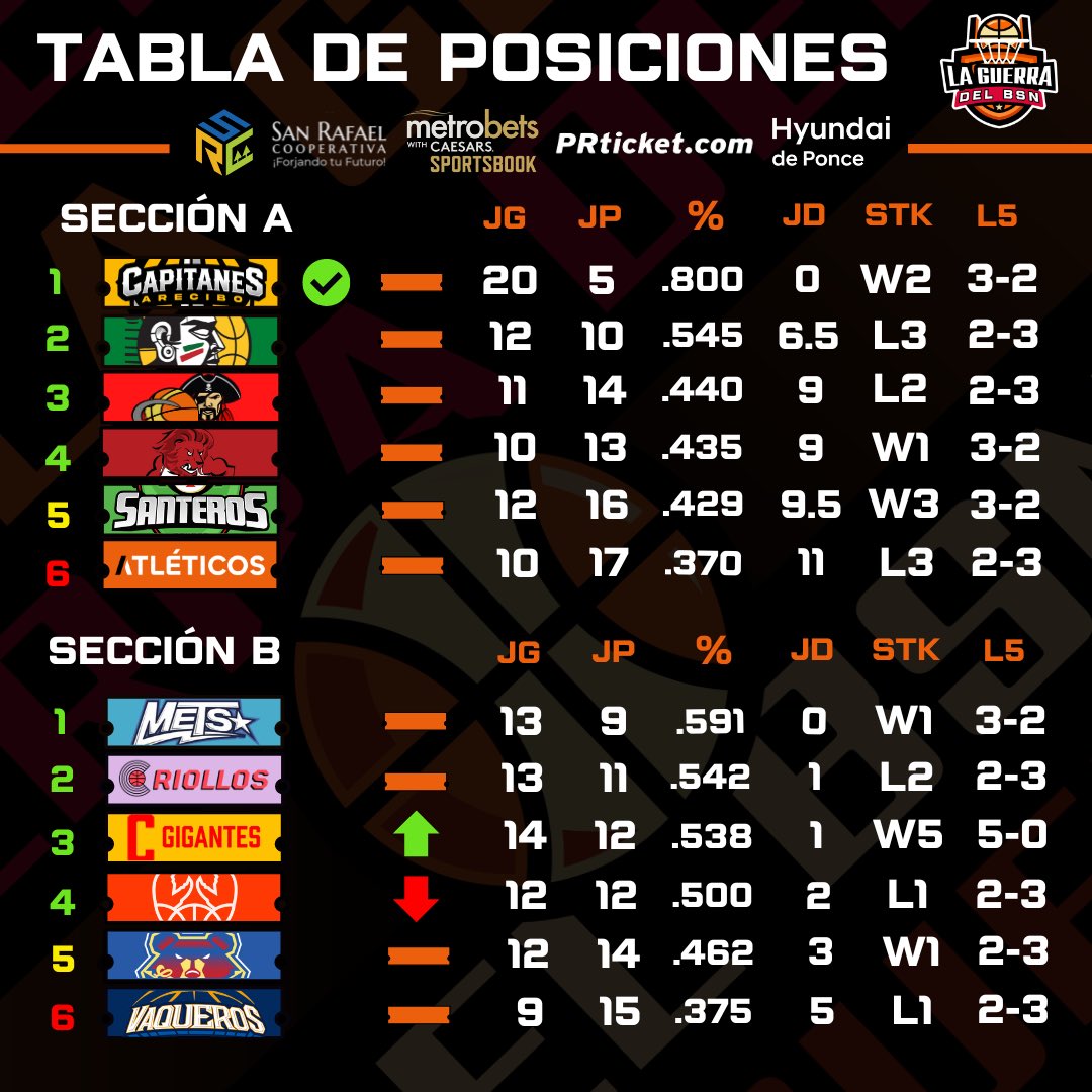 Este jueves hay doble jornada del BSN, dos partidazos, uno de cada sección. Los Gigantes de Carolina (14-12) se medirán de local ante los Mets de Guaynabo (13-9) en busca de arrebatarles ese primer lugar de la sección B. Por otro lado, los Santeros de Aguada (12-16) buscarán defender la cuarta plaza de la sección A ante los leones de Ponce (10-13).