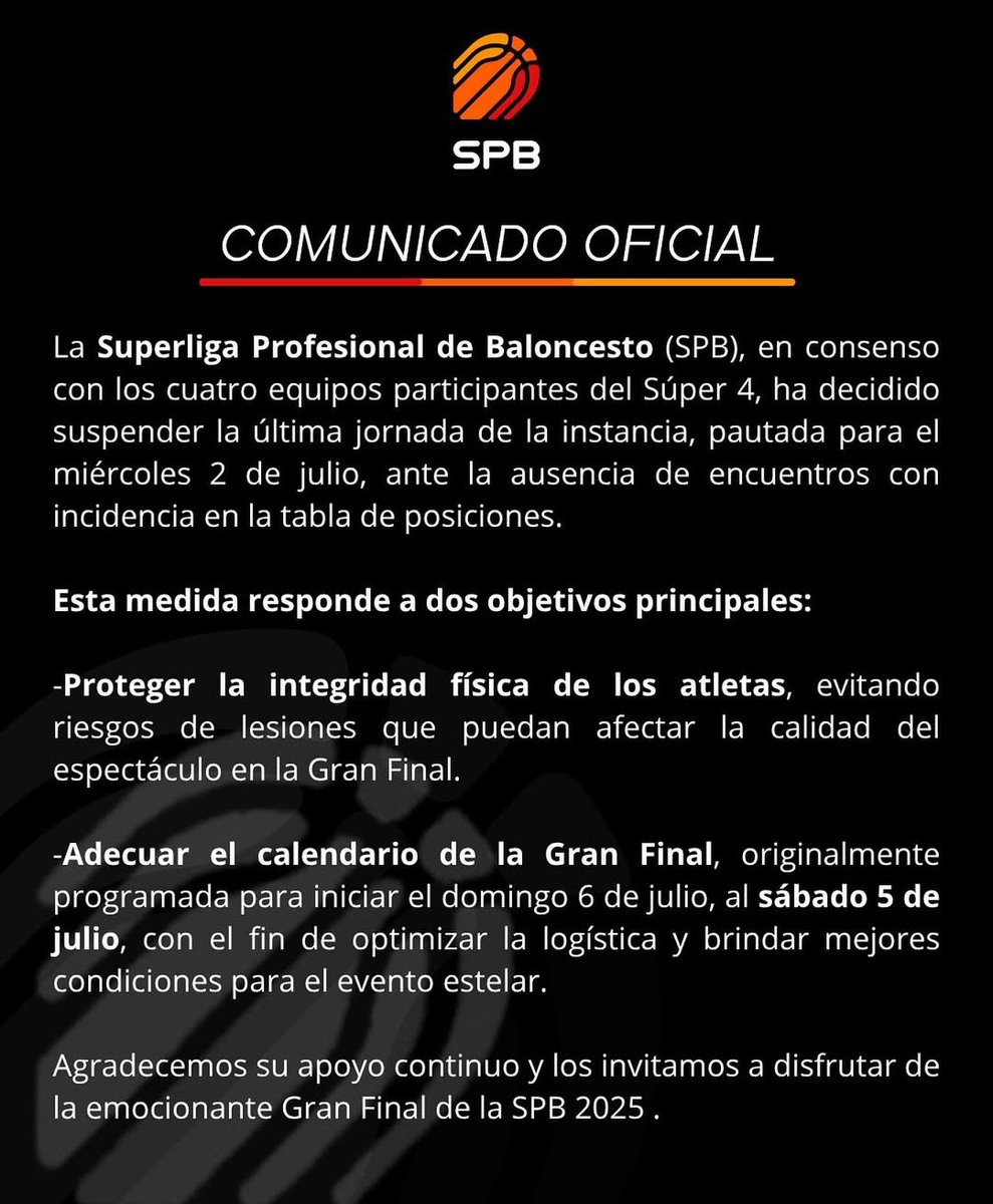 Mediante un comunicado, se informó de las razones por la cuales se tomó la determinación de suspender la jornada pautada para el miércoles 2 de julio y el adelanto de la gran final para el sábado 5.
