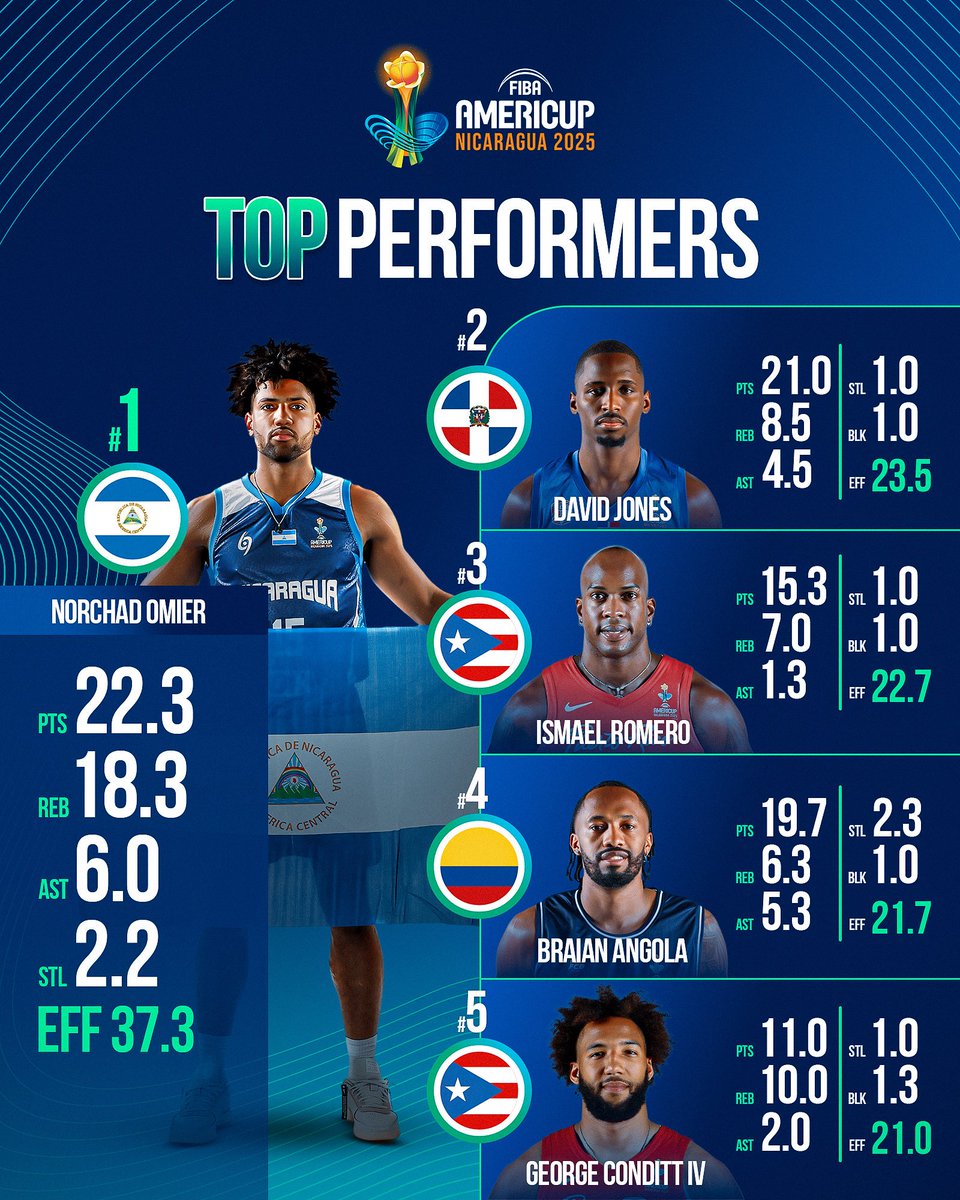 Promedios: 15.3 puntos, 7.0 rebotes, 1.3 asistencias, 1.0 robos y 1.0 tapones para 22.7 de valoración (22.4 minutos) - (Pívot) NORCHAD OMIER: Nicaragua no pudo clasificar pero lo del pívot de Cleveland Cavaliers fue extraterrestre. Dos partidos rozando el triple-doble ante Argentina y Republica Dominicana y una actuación de 30+20 ante Colombia y todo ante grandes pívots del continente como Francisco Caffaro, Joel Soriano o Ángel Delgado.