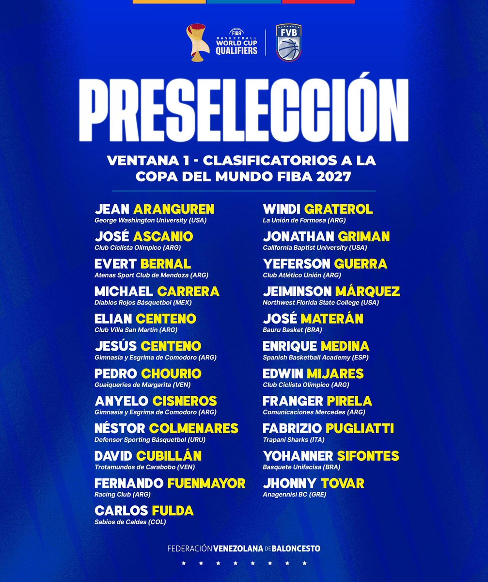 Esta es la fecha en la cual los jugadores reciben la liberación de sus respectivos clubes profesionales. En la lista se puede observar el llamado de Pedro Chourio, Néstor Colmenares, José Materan y Alejandro Bernal y el novato Jesús Centeno quienes no estubieron en la preselección pasada.