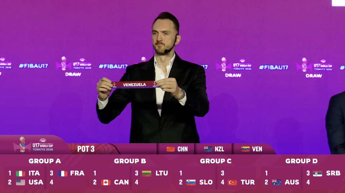 En la mañana de este jueves se realizó el sorteo de la fase de grupos de la Copa del Mundo FIBA U17 2026 en Estambul, Turquía, Venezuela debutará el sábado 27 de junio ante Costa de Marfil. Luego enfrentará a Serbia (28/06) y a Australia (30/06).